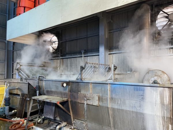 収穫されたわかめはすぐに加工場に運ばれ、約90度のお湯にくぐらせ湯通し・塩蔵・脱水の工程を経て製品化されます。