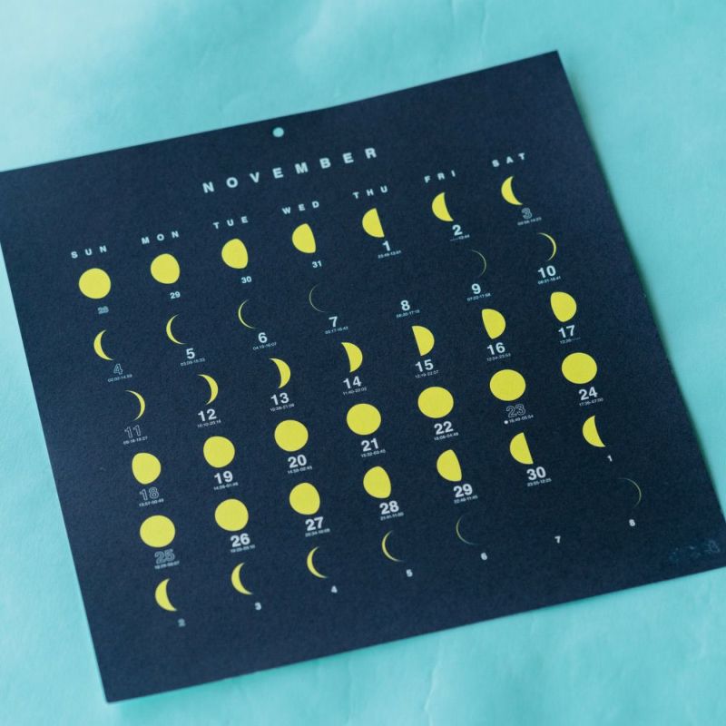 MOON CALENDARは、1年間の月の満ち欠けと出と入りの時刻をあらわしたカレンダーです。「365日いつでも月とともに」、「シンプルで美しいものを日常に」をコンセプトに、1990年代よりノマドによるデザインをcanyon & beach が制作・販売開始。そして2018年版よりAOKIWORKS と ツギキ が、ノマドの想いをそのままに制作・販売を引き継いでいます。MOON CALENDARは、印刷・資材 インキや紙、印刷方法などできる限り環境に配慮した素材を使用。毎年、淡路島と限られた店舗のみでの数量限定販売しています。欠けては満ちる月が並ぶシンプルで美しいデザインは、飾るだけで部屋の雰囲気を洗練させてくれます。