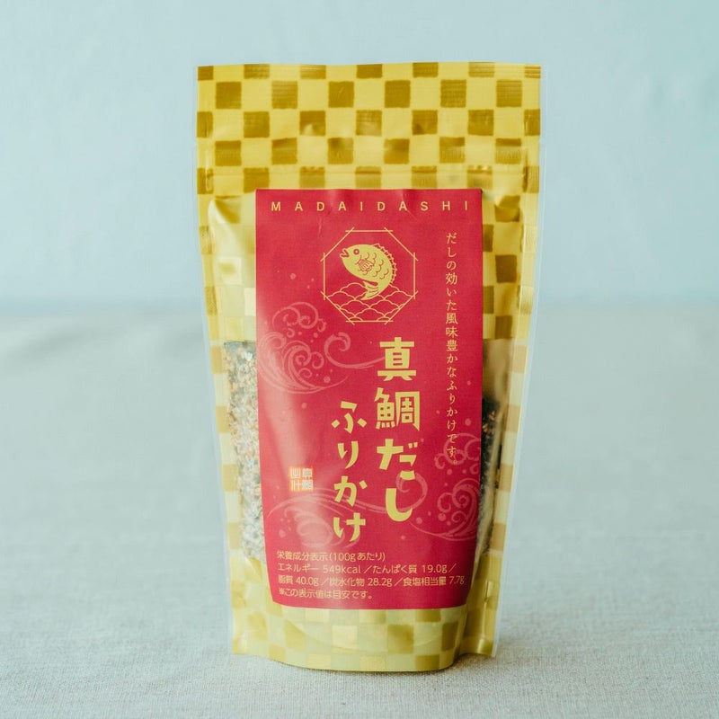 | 原材料名 | ごま加工品(ごま、いわし煮干し、その他)(国内製造)、真鯛だし粉末(食塩、砂糖、真鯛エキス粉末(真鯛、デキストリン)、乳糖)、ふりかけの素(食塩、焼きのり、鰹節粉末、砂糖、ぶどう糖、でん粉、醤油、鯖節粉末、酵母エキス、煮干エキスパウダー、発酵調味料、香辛料)/調味料(アミノ酸等)、トレハロース、酸化防止剤(V.E)、(一部に小麦・乳成分・さば・ごま・大豆を含む) |