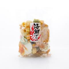 でん粉(じゃがいも、とうもろこし、さつまいも、タピオカ、緑豆)、もち米、小麦粉、植物油脂、いか、えび、しょうゆ、たこ、砂糖、あみ、食塩、みりん風調味料、でん粉分解物、わかめ、いわし(煮干し)、あおさ、のり、海産物エキス(こんぶ、かつお、えび、おきあみ、あさり)、果糖ぶどう糖液糖、ごま、風味原料(かつおぶし、こんぶ、煮干し、しいたけ)、還元水あめ、粉末油脂、醸造酢、乳糖、ぶどう糖、酵母エキス、みりん、たんぱく加水分解物、魚醤、加工デンプン、調味料(アミノ酸等)、膨張剤、着色料(アナトー、パプリカ色素、紅麹、カラメル、クチナシ、ラック)、香辛料、乳清焼成カルシウム、甘味料(ステビア、甘草)、酸味料、塩化カルシウム、酸化防止剤(ビタミンE)、乳化剤、(原材料の一部にさば、りんご、ゼラチンを含む) |